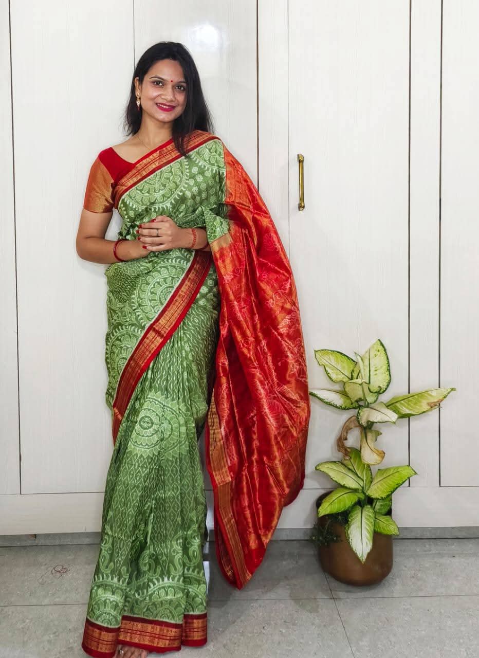 Sambalpuri silk sarees are exquisite handwoven sarees originating from Odisha, India, renowned for their intricate ikat designs and vibrant colors. These sarees are crafted using a unique tie-and-dye technique called “Bandha,” where both warp and weft threads are dyed before weaving, creating unique patterns that appear on both sides of the fabric. They are typically adorned with traditional motifs like conch shells, wheels, and flowers, often symbolizing cultural or religious elements.